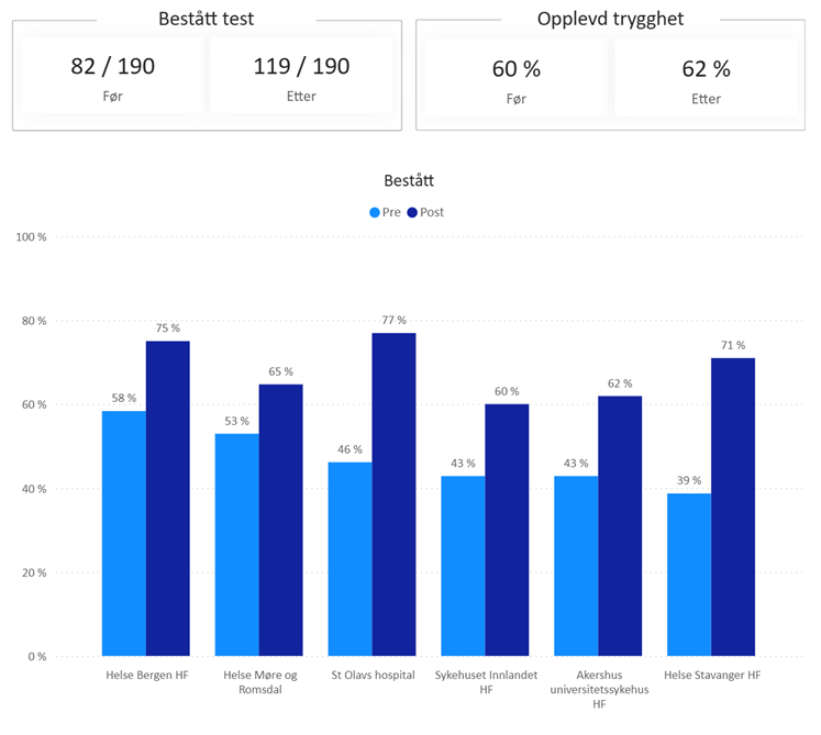 Læringsutbyttet er evaluert med en kompetansetest som gjennomføres ved oppstart og tidligst tre måneder senere. Kartleggingen bygger på 11 864 pre-tester, mens evalueringen av læringseffekt bygger på 190 deltakere som har gjennomført både pre- og post-test. Andelen deltakere med høy måloppnåelse (≥90 % riktige) økte fra 43,2 % (82/190) før til 62,6 % (119/190) etter opplæring. Gjennomsnittlig kompetanseskår økte med 2,35 poeng (pre 69,43; post 71,78), noe som tilsvarer en liten til moderat læringseffekt (d=0,35; p<0,001).