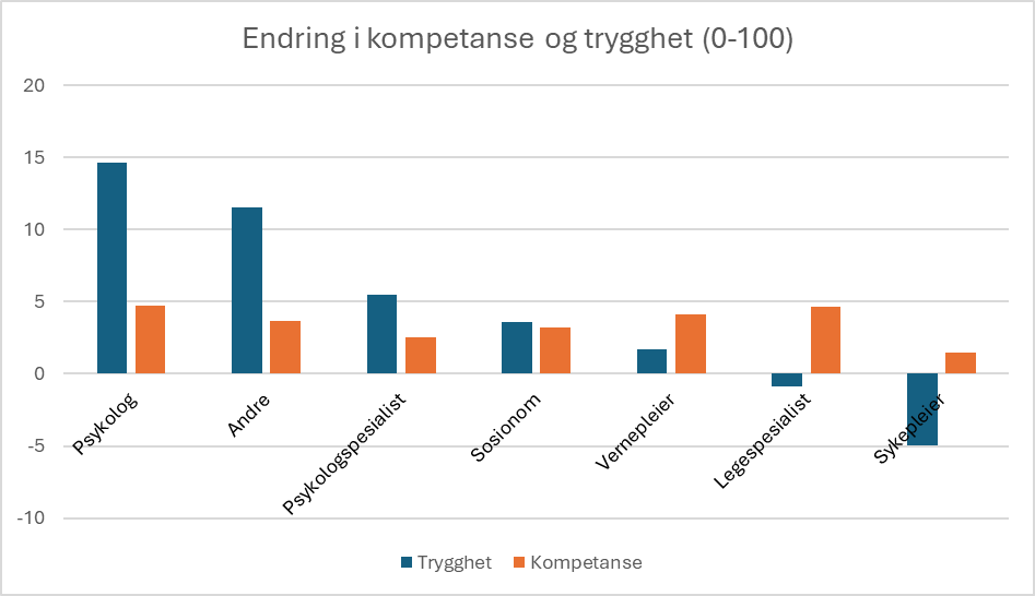Endring i opplevd trygghet på egen kompetanse i selvmordsforebyggende klinisk arbeid var liten i gjennomsnitt (pre 60; post 62), men varierte mellom yrkesgrupper. Psykologer og «andre» rapporterer betydelig økt mestringsopplevelse, og psykologspesialister, sosionomer og vernepleiere har noe økning. Legespesialister og sykepleiere viser derimot noe reduksjon i opplevd trygghet. Dette kan skyldes at Simple og/eller retningslinjen legger opp til nye måter å jobbe på.