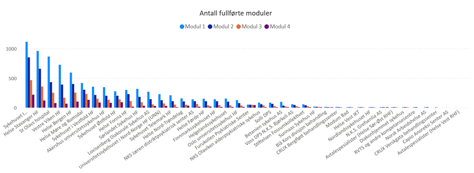 Siden november 2024 har om lag 13 000 ansatte i psykisk helsevern og TSB gjennomført om lag 18 000 opplæringsmoduler i Simple. Opplæringen er gjennomført på tvers av 250 avdelinger i 19 av 20 offentlige helseforetak, i tillegg til private og ideelle foretak med rammeavtale. Aktiviteten har økt gradvis gjennom 2025, med 1 000–1 200 aktive brukere per uke i høst.
