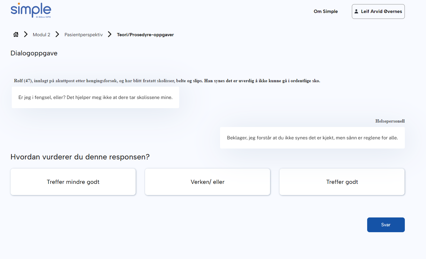 Modul 2 introduserer fem nye kasus, fra DPS, akuttmottak, FACT og BUP. For å best modulen må du bare ha gjennomført ett kasus. Men alle er forskjellige, og de vektlegger ulike faglige problemstillinger, prøv deg gjerne på flere.